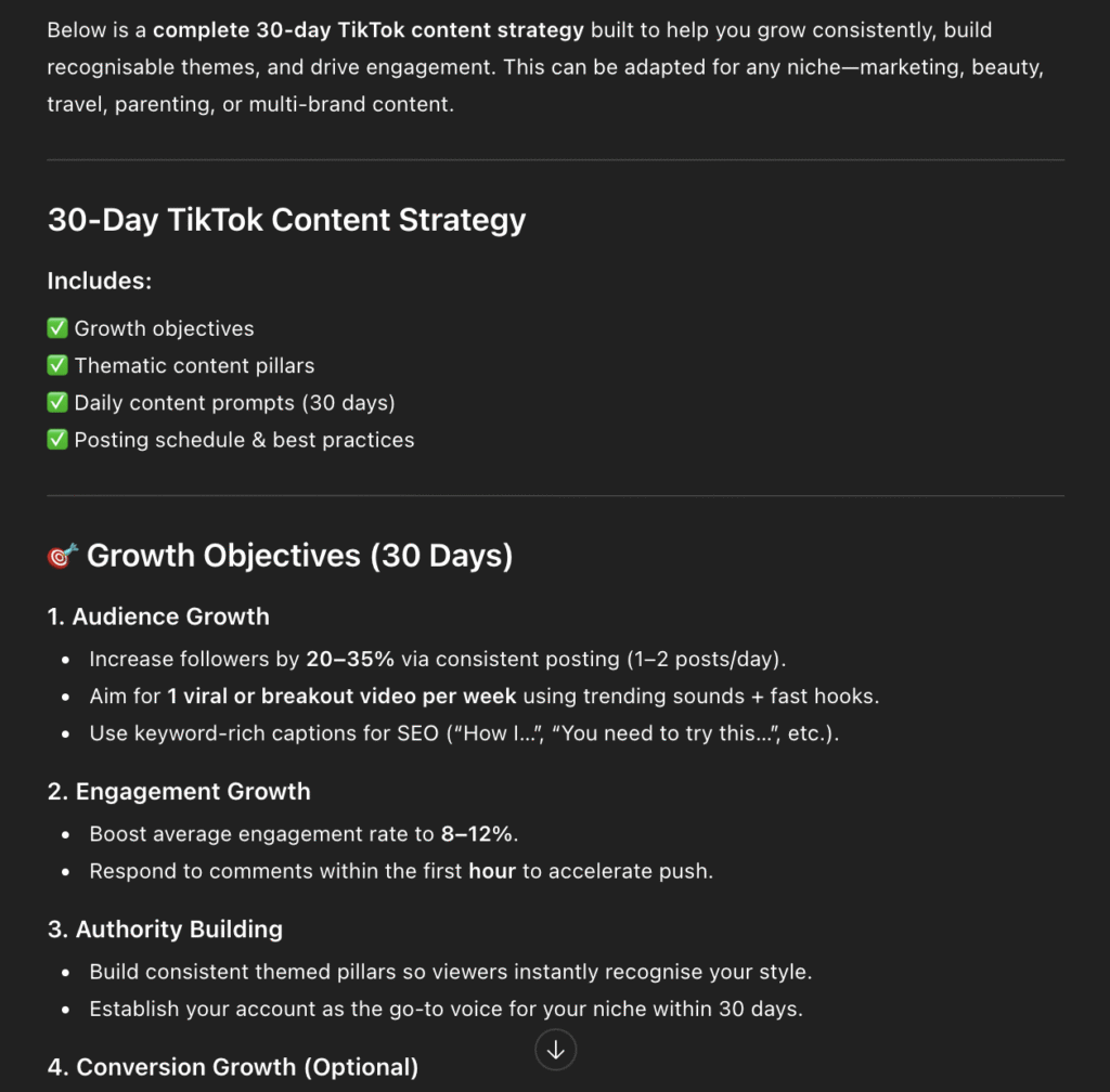 “Create a 30-day TikTok content strategy with growth objectives, thematic pillars, daily prompts, and posting schedules.”